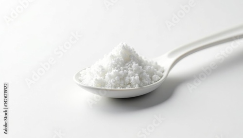 Spoonful of white sugar against white backdrop, texture, sugar, spoon