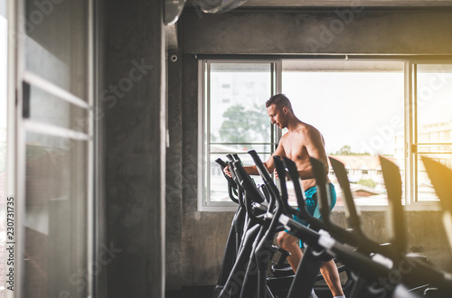 Sport man doing exercises training on xtrainer machines,Cross fit body and muscular in the gym