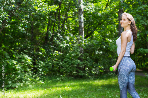 Sport woman doing exercises with dumbbells outdoors.