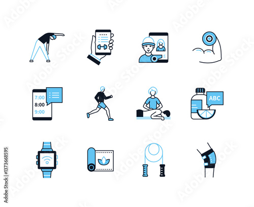sport, stretch, gymnastics, aerobic, app, smartphone, fitness, dumbbell, trainer, whistle, online, bicep, strength, training, alarm, clock, schedule, running, marathon, massage, man, woman, vitamin, lemon, tablet, smart, watch, yoga, rug, skipping, rope, retainer, active, health, collection, design, icon, line, set, vector, web, white, style, idea, graphic, colours, modern, editable, stroke, blue