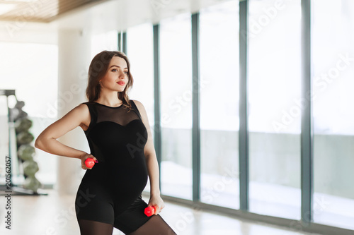 Sports and fitness for pregnant women. Portrait of a young pregnant woman. Young beautiful pregnant woman in fitness gym.