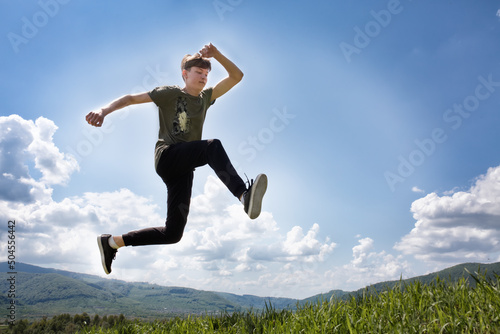 Sports guy in a jump. High jump in the mountains. Summer landscape. Ukrainian Carpathian mountains.