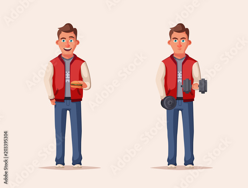 Sportsman pumping iron gym. Strong character design. Cartoon vector illustration.