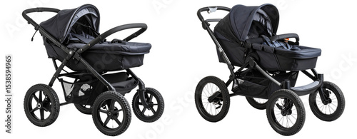 Sporty Baby Stroller with Large Wheels and Storage Basket, isolated on a transparent background.