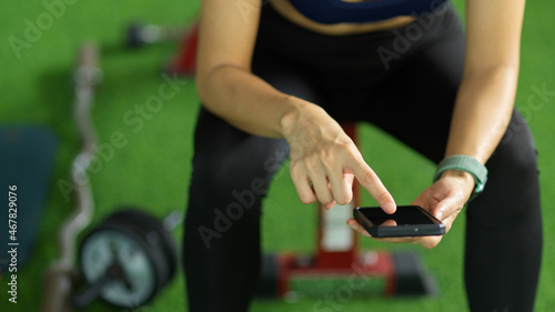 Sporty girl in sportswear using modern smart mobile phone at the gym.