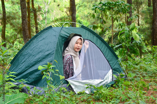 Sporty Muslim Asian woman standing near tent and backpack, enjoying sunny afternoon in the mountains. Camping lifestyle concept