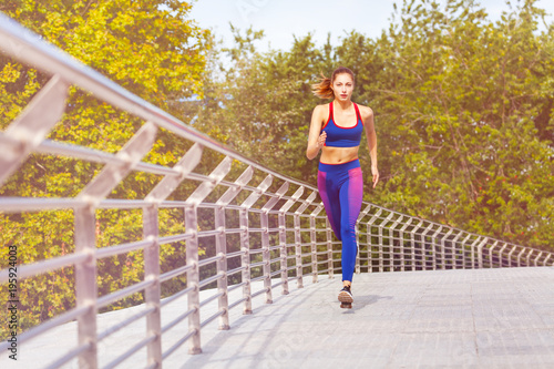 caucasian, woman, girl, young, youth, sport, sporty, action, motion, active, activity, athlete, athletic, aerobic, fit, fitness, gymnastics, physical exercise, warmup, exercise, train, training, practice, physical, cardio, healthy, life, care, lifestyle, body, outdoors, city, town, urban, park, bridge, runner, jogger, run, jog, sprinter, race, track, marathon, fast, speed, wellness, recreation, summer, fun