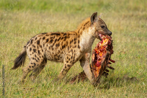 Spotted hyena walks with carcase on savannah