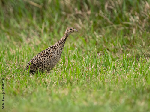 Spotted Nothura with intricate brown and black plumage, standing in a grassy field