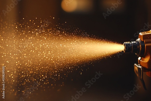 spray, aerosol, liquid, paint, coating, airbrush, nozzle, gold, gold, particle, blur, blurred, light, lighting, sharpened, bokeh, background, dark, industry, industrial, equipment, tool, machinery, detail, closeup, texture, metallic, surface, stream, mist, vapour, air, pressure, application, finish, fine, design, shine, glistering, glittering, orange, renovation