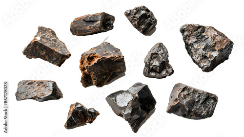 Spread of meteorite fragments arranged neatly on transparent background.