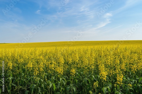 Spring and summer landscape with a yellow rapeseed field beneath the sky