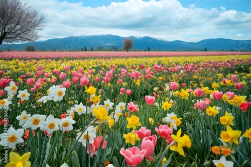 Spring Awakening: Colorful Field of Daffodils and Tulips Under Blue Sky