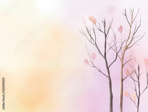 spring background greenery gradient concept, A serene watercolor illustration of bare trees with soft pink leaves against a pastel background, evoking a tranquil, dreamlike atmosphere.