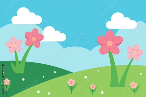 flower, spring, sky, nature, summer, grass, landscape, vector, field, illustration, meadow, flower, floral, sun, cartoon, butterfly, garden, leaf, plant, design, art, cloud, card, season, blossom