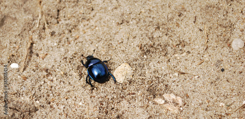 Spring black and blue beetle on sand or soil with limestone parts.