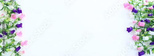 spring bouquet of purple, white and pink bell flowers over white wooden background. top view, flat lay
