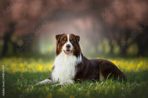 animal, spring, nature, dog, pet, puppy, canino, cute, grass, mammal, white, breed, brown, green, portrait, young, purebred, domestic, pink, friends, flower, aussie, shepherd, fur, lie, look, park