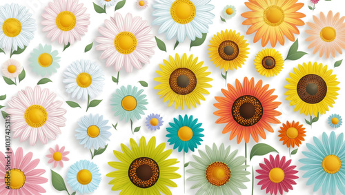 Spring flowers colorful vector set isolated in white background. Collection of daisy and sunflowers with various colors for spring season as graphic elements and decorations. Vector illustration.