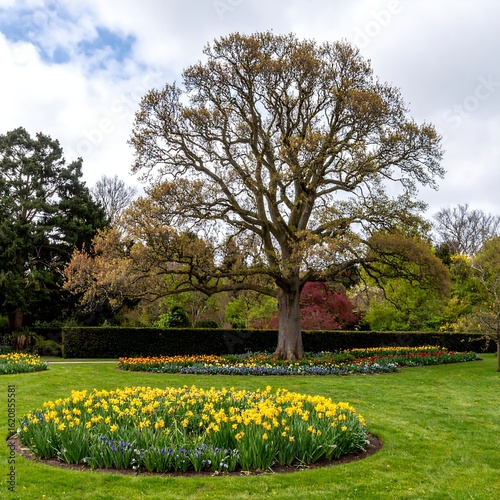 spring, garden, tree, flower, tulip, daffodil, grass, landscape, nature, bloom, colourful, park, green, blue, red, yellow, large, sky, cloud, beautiful, floral, growth, parkland, arrangement, design, season, tranquil, peaceful, botanical
