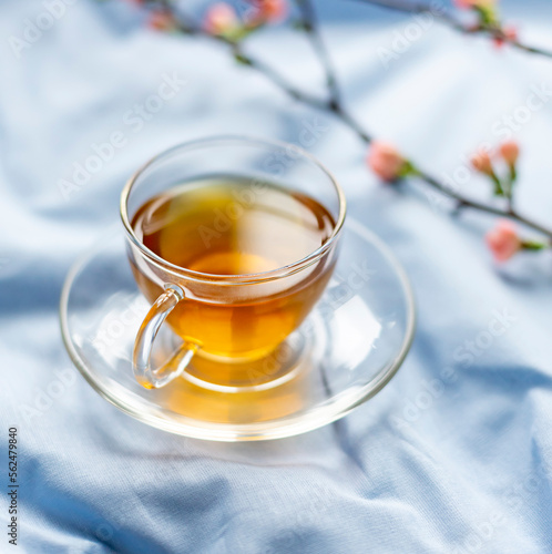 tea, cup, spring, glasses, drink, breakfast, beverage, bed, hot, white, liquid, mug, transparent, quince, closeup, concept, saucer, healthy, green, teacup, herbal, black, closeup, food, water, fresh, brown, aroma, cotton, textile, tree, tree branch, blue, floral, flower, nobody, nature