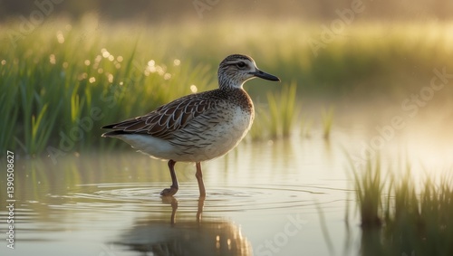 Spring season, courtship of The Ruff birds. A colorful, spotted bird in its natural wetland habitat. Wedding plumage of a wader bird. Photography at water level.