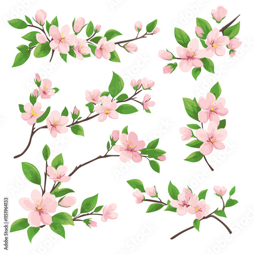 Spring set of flowering branches. Cherry blossoms sakura branch with flowers in silhouette style. Vector botanical isolated illustration.
