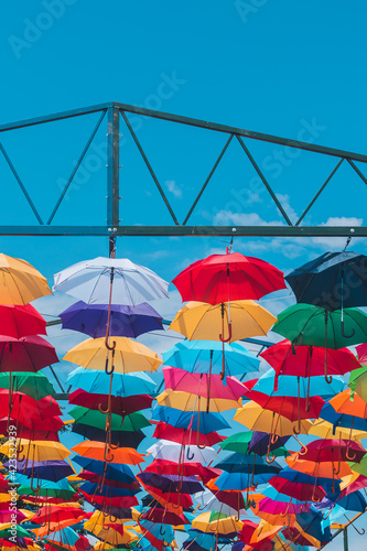 parasol, umbrella, sky, beach, rain, summer, blue, colourful, isolated, weather, white, protection, red, colours, yellow, open, green, travel, sunshade, orange, nobody, sun, object, sea, vacation