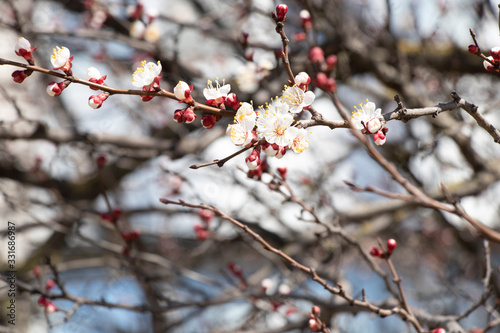 Spring sunny day. Fruit trees bloom, the air is warm and sweet. Blue sky. Smelly.