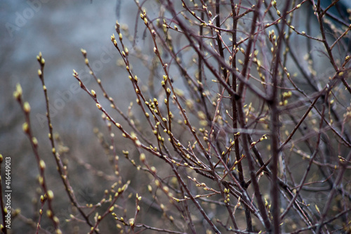 Spring. Swollen green buds on the bare branches of trees