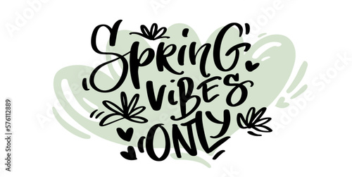 Spring vibes only hand lettering on light green floral shape. Seasonal template hand drawn style. Vector design for stickers, social media, banners, ads.