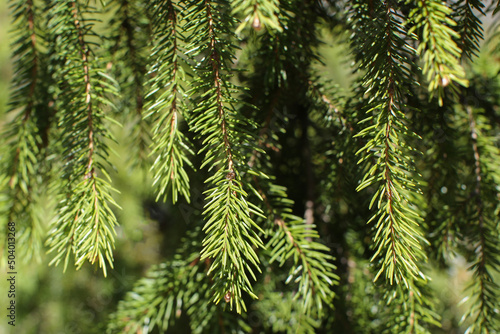 Spruce branch. Beautiful branch of spruce with needles. Christmas tree in nature. Green spruce. Spruce close up.