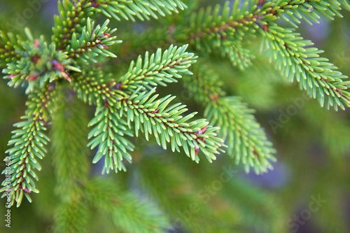 Spruce branch with short needles close-up. Natural background, green Christmas tree texture, pattern. Christmas, new year. Space for text. Selective focus