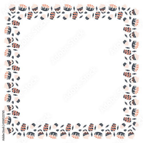 Square isolated frame made of black-pink-red cakes, sweets, tiramisu strawberries, meringues, cupcakes and cranachan on a white background. Scandinavian style. For text, flayer, card etc. Vector.