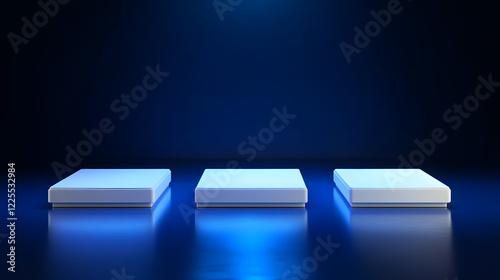 Square podiums are white. Abstract background. A stage for the demonstration of cosmetics. Podium for the award, consisting of three 3 square figures of different sizes on a blue background. Showcase