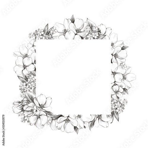 frame, flower, floral, design, vintage, leaf, illustration, nature, pattern, decoration, art, border, ornament, plant, chaplet, card, drawing, summer, black, invitation, decor, tree branch, paper, ornate