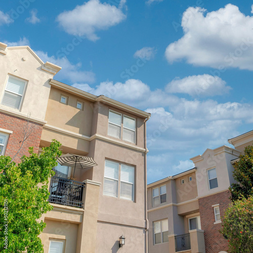 downtown, california, apartment, building, exterior, structure, row house, low angle, tree, residential, outside, no people, no one, community, neighbourhood, design, balcony, lounge, view, umbrella, window, design, brick, painted, complex, architecture, architectural, rent, deck, terrace, sky, background, clear sky, blue skies