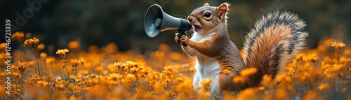 Squirrel holding a megaphone in a field of yellow flowers, quirky scene