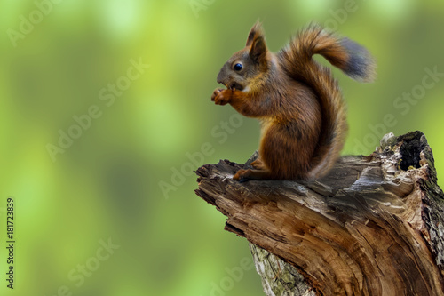 Squirrel on a broken tree eating nuts or seeds. Squirrel in the woods or in the Park on a green background. Stump