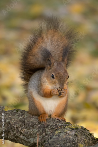squirrel, nature, autumn, leaf, animal, rodent, outdoors, nut, mammal, wildlife, fall, forest, fluffy, wood, brown, fur, cute, tail, portrait, yellow, day, season, tree, tree branch, beauty, eat, foreground, closeup