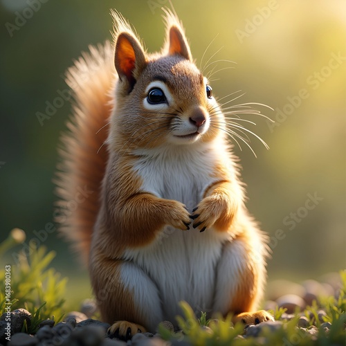 Squirrel, squirrel sitting in nature, sunlight falling on it from the side, making it more visible and attractive, close-up shot, natural background