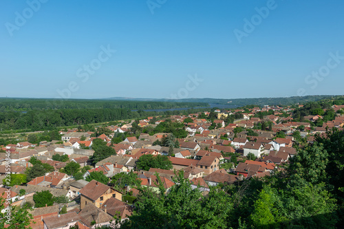 Sremski Karlovci, Serbia - May 2, 2018: Panorama of Sremski Karlovci. Panoramic view of the roofs of the house, Chappel of Peace and Danube river.