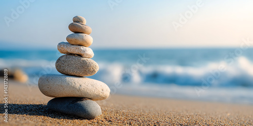 ai, image, concept, conceptual, illustration, advertising, advertisement, beach, sea, ocean, vacation, holiday, detente, zen, stack, rock, balanced, stone, balance, meditation, health, mental, wellness, peace, calm, serene, serenity, stone, pebble, nature, water, spa, harmony, sand, tower, heap, sky, stability, pyramid, stacked, pile