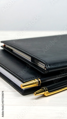 notebook, black, leather, pen, gold, stack, book, journal, office, business, planning, organised, productivity, writing, study, work, supply, accessory, closeup, detail, elegant, professional, stylish, wooden, table, surface, light, white, paper, detail, stationary, equipment, item, design, modern, simple, clean, minimalist, focused, meeting, preparation