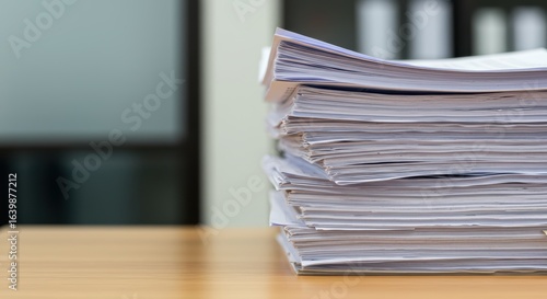 Stack of business paper document on wood desk in office. File storage and document management for work. Office work and administration concept for ad banner or poster with empty space.