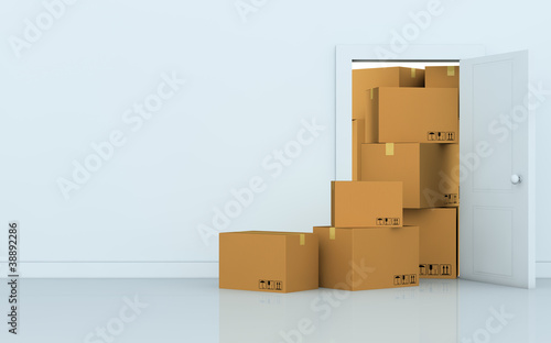 three-dimensional, apartment, box, brown, card, cardboard, cardbox, clean, container, deliver, empty, estate, floor, home, house, indoor, interior, modern, moving, new, nobody, office, package, cardboard box, packing, pile, real, relocation, render, residential, room, space, stack, storage, transport, transportation, wall, door