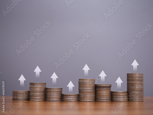 Stack of coins with arrow rising icons. The concept of business growth, Financial investment, Market stock, Profit return, Dividend and Business fund.