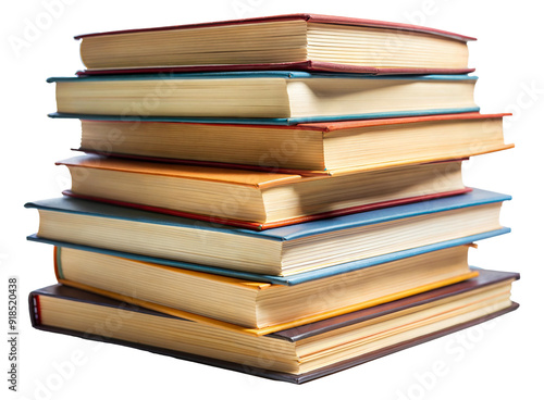 Stack of colorful hardcover books in a vertical pile isolated on transparent background