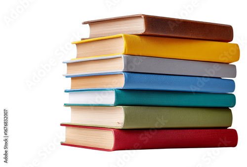 Stack of colorful hardcover books with different colored spines, isolated on transparent background