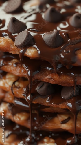 stack of cookies, showcasing layers of rich chocolate chips and golden brown edges, with a drizzle of melted chocolate on top